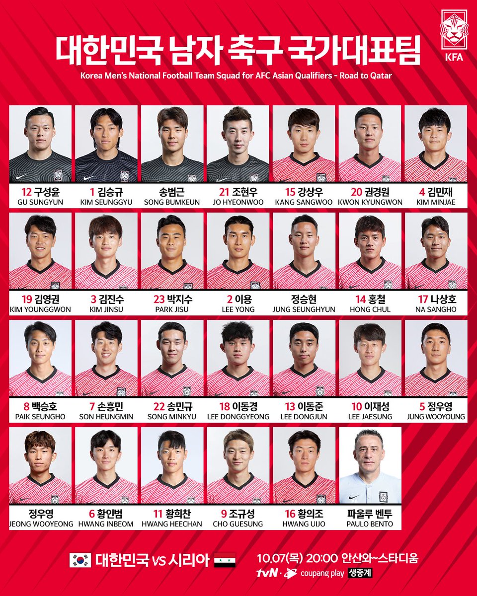 2022 카타르 월드컵 아시아지역 최종예선 a조 경기를 오는 2일 이라크와 7일 레바논과 맞대결을 펼치게 됩니다. 한국 축구 국가대표팀 명단이 오는 8월 23일 파울로 벤투 감독을 통해 발표되었습니다. 황의조를 비롯해 페네르바체 김민재 마인츠 이재성 루빈 카잔 황인범 등.